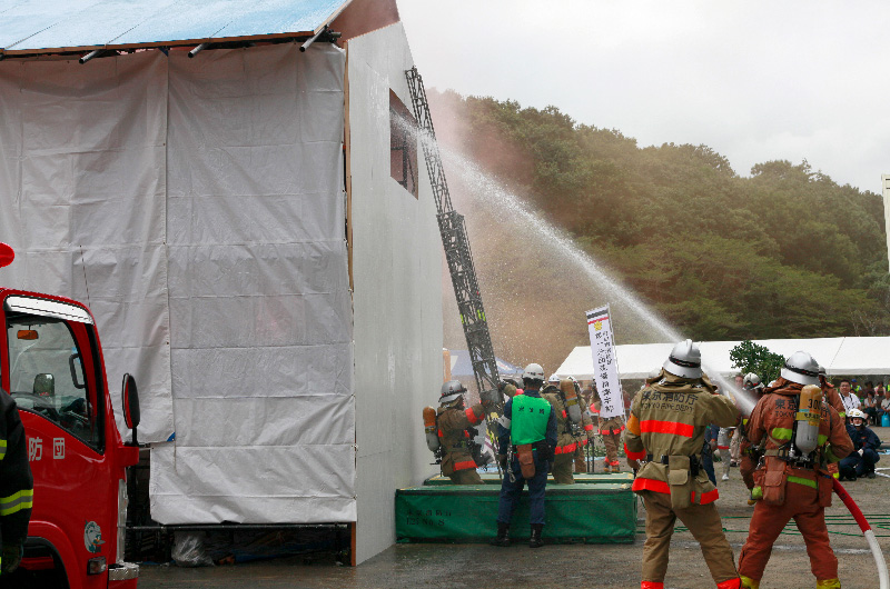 防災関係機関による展示や、消火器による初期消火や起震車などの体験、そして消防隊はじめ関連機関が連携して倒壊家屋からの被災者救出等の実際の災害を想定した人命救助の合同演習がありました。